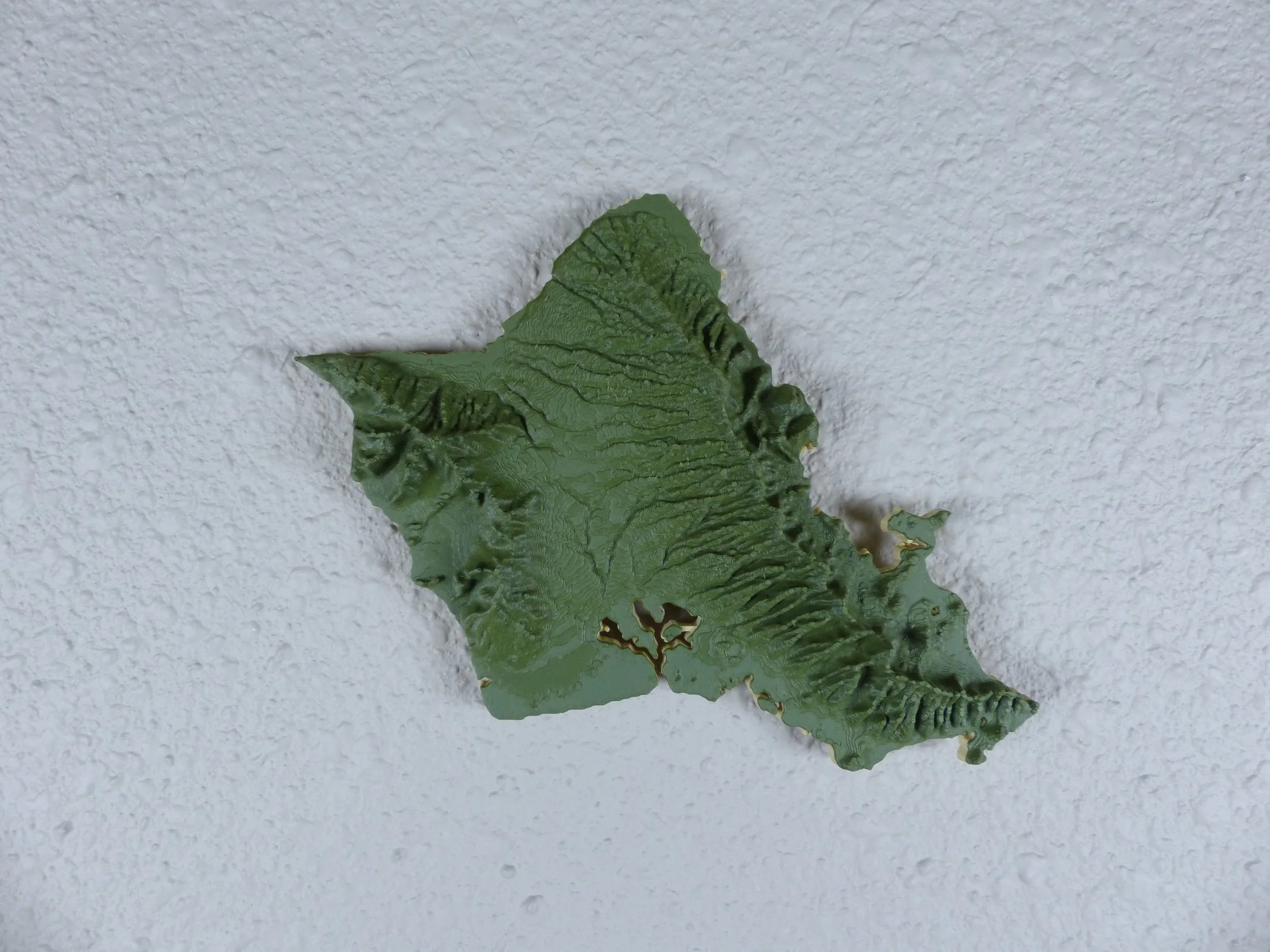 A purchase will give you a printed model of your chosen size (width measured in inches), with a variation of 1-to-1 elevation scaling or exaggerated elevation. The 1-to-1 elevation scaling is flatter, and is the perfect piece for your wall. The exaggerated elevation version brings out the detail of the cracks and crags of the mountain, and looks fantastic on a desk, coffee table, or mantel.